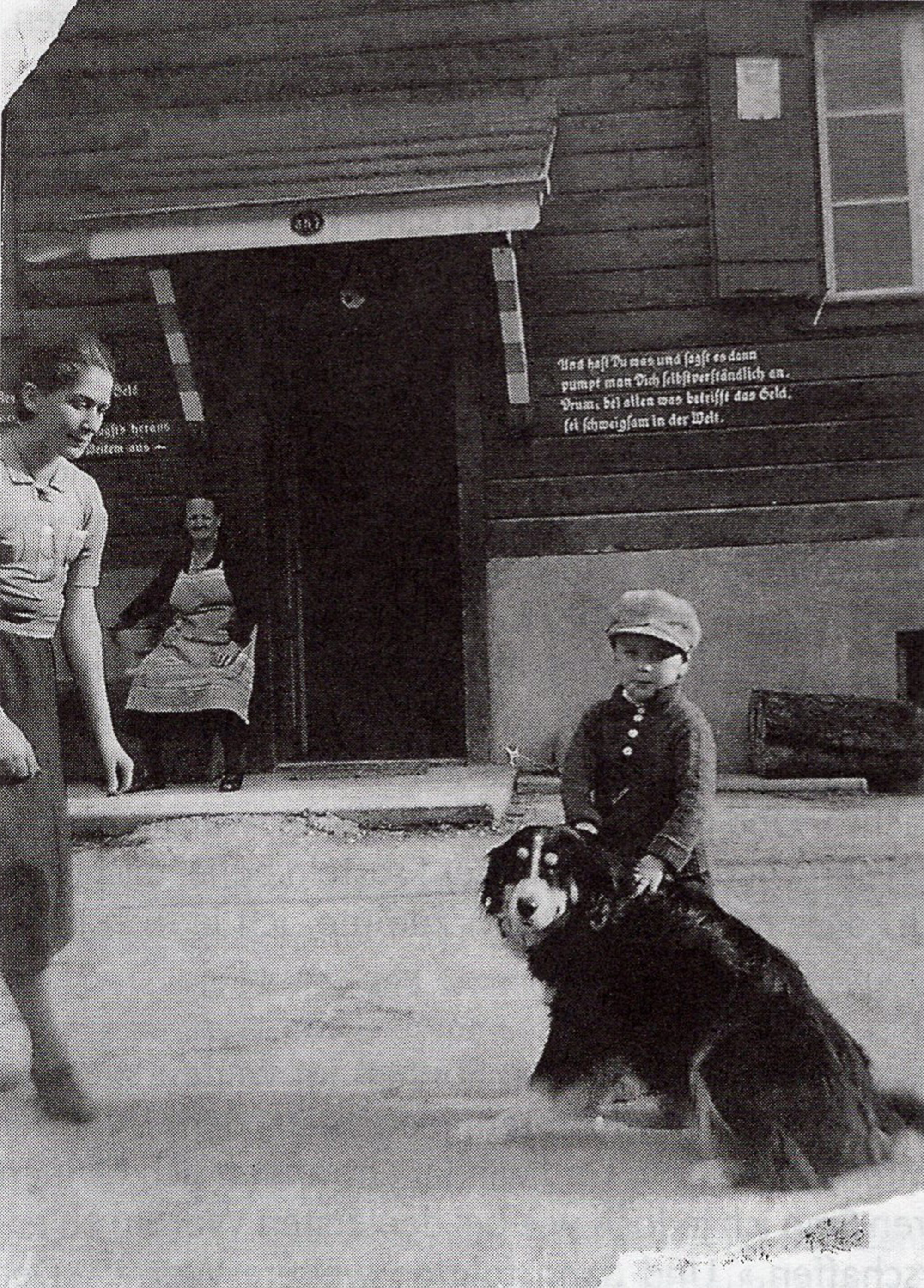 Eduard Albert Meier im Alter von ca. 4 Jahren mit ‹Bärry›, dem Dürrbächler der Familie, vor dem Haus seiner Grossmutter in Niederflachs (Bülach). Links seine Mutter, Bertha, im Hintergrund vor dem Haus sitzend eine Nachbarin.