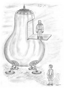 那是一個金屬製的奇特構造物,直徑大概只有五、六公尺,看起來相當古怪。它呈梨形,不遠處降落在地上,而我則目不轉睛地盯著它。很快我看到它側邊突然打開了一個口子,一個人影走了出來,並搭著一個平台緩緩向我飄來 —— 那是一位看起來非常非常年邁的老人,穿著一套銀色的奇裝異服。