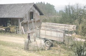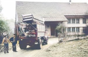 The first transport of building materials in front of the house. To the left of the truck Jakob Bertschinger senior and his son Jacobus.
