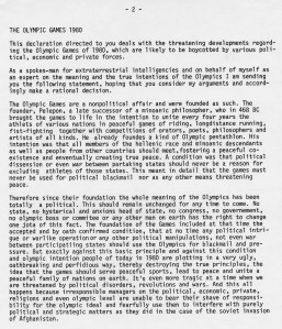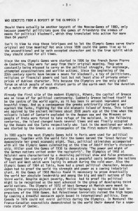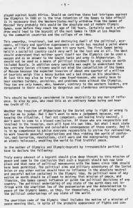 第三部分談到有關在 1980 年於莫斯科舉辦的夏季奧運會,由於預測蘇聯軍隊將在 1979 年底入侵阿富汗,因此美國等將發起聯合抵制當屆奧運會運動。Prejaren因此建議比利向世界各國領袖與奧運會主辦單位寫一封精簡而重要的信,主要是述說奧運的創辦宗旨與精神,應該秉持中立原則,強調政治決不該干涉奧運會的進行。而由於他的努力,整體上是有助於改善政治力的介入,但由於那些與此有關的負責人心胸狹隘,功勞卻不會算在他身上。
