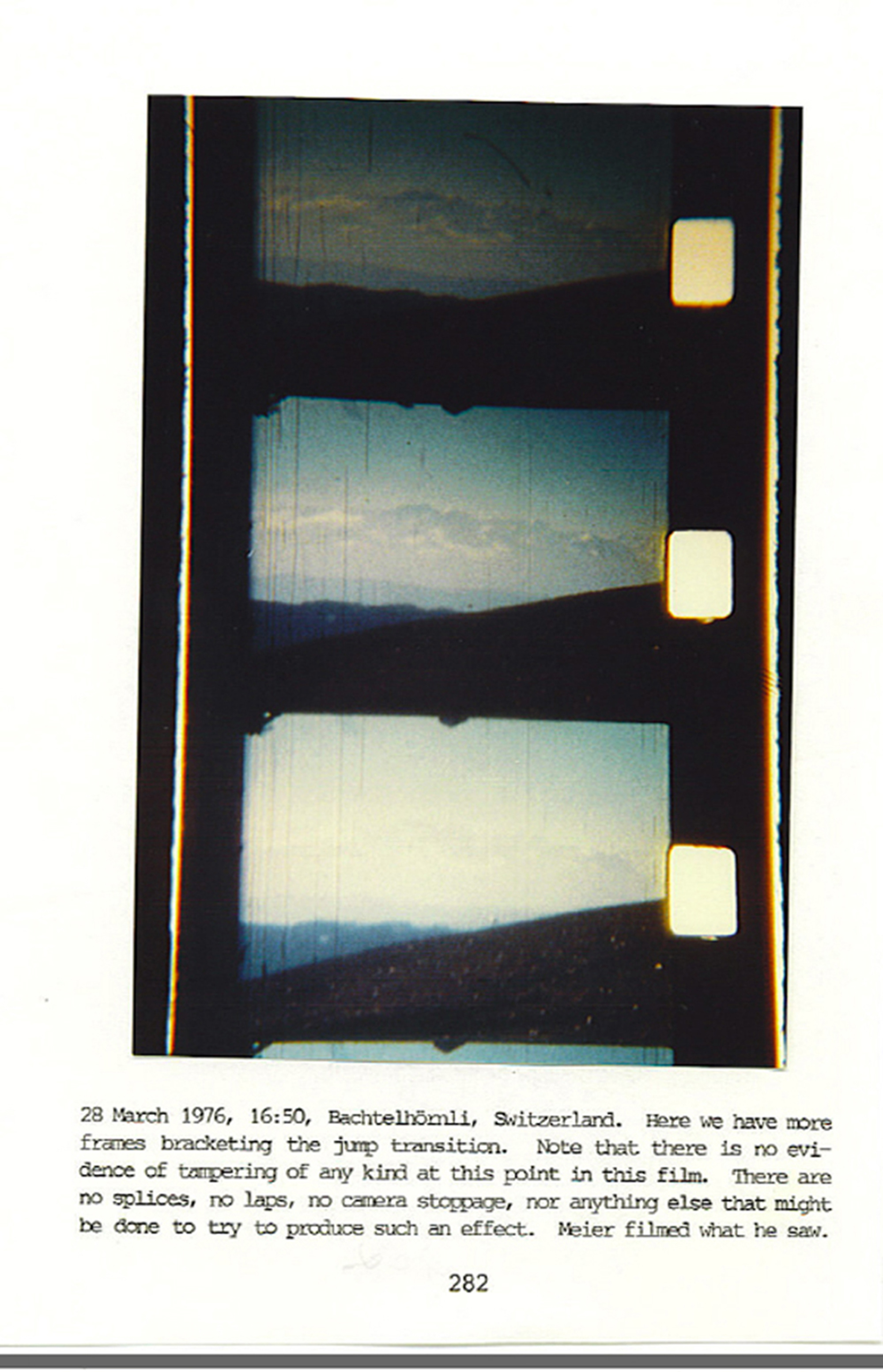 1976年03月28日,16:50,「Switzerland/瑞士」-「Bachtelhörnli」。这里有记录“jupe transition/跳跃过渡”的更多(视频)帧。请注意,在这部视频的这一点上不存在任何类型的篡改证据。没有拼接,没有叠片,没有摄录机卡顿,也没有任何其它试图制造这一效果的东西。Meier(只是)拍摄了他所见到的(一切)。