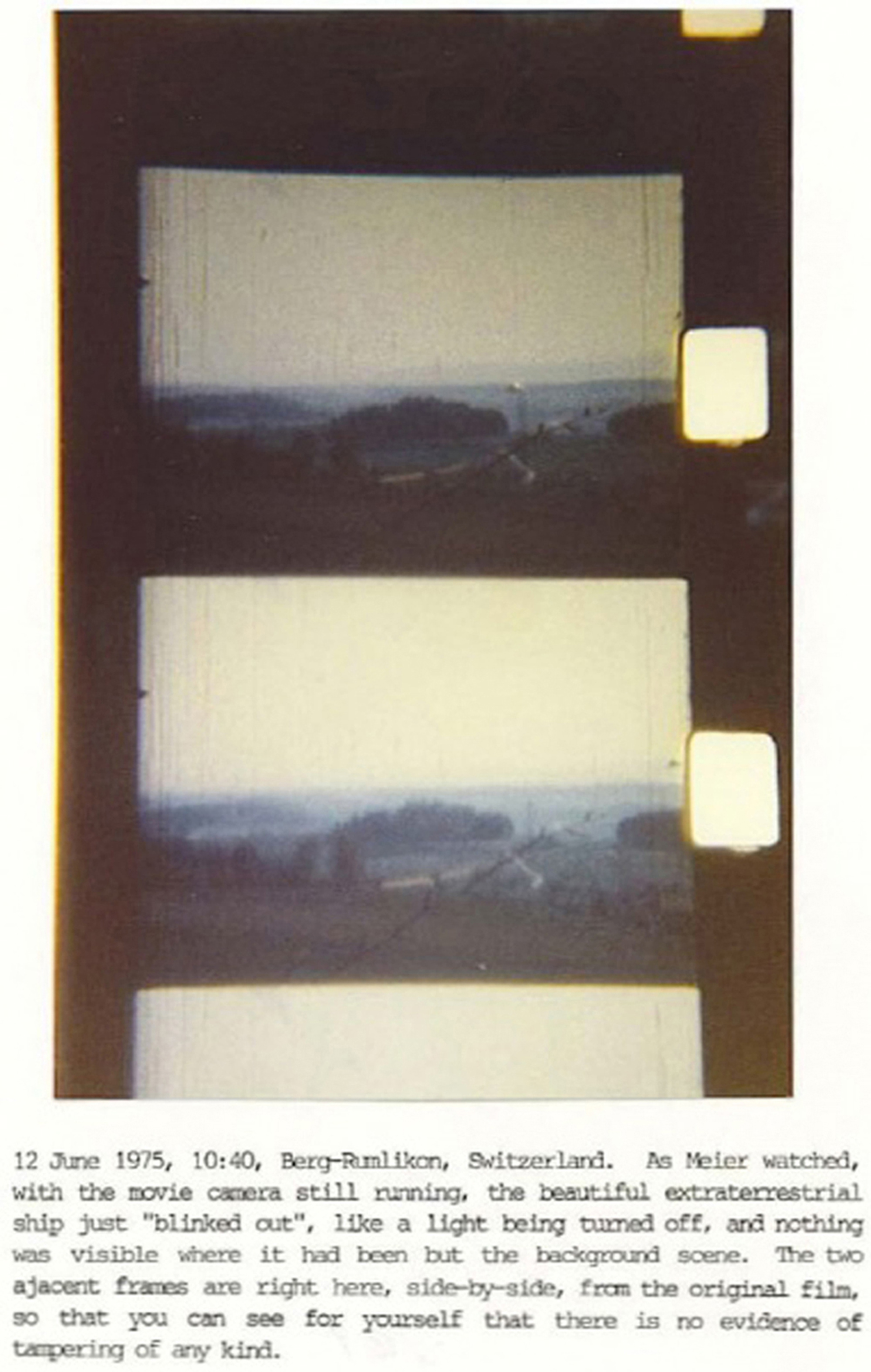 1975年06月12日,10:40,「Switzerland/瑞士」-「Berg-Rumlikon」。Meier注视着,视频摄录机仍在运转,这艘漂亮的外星飞船只是“blinked out/眨了一下”,就像一盏灯一样,被关掉了,除了背景场景外…没有任何东西可见。出自源(胶片)文件的…相邻两个(视频)帧就在这里,并排放在一起,这样你可以亲眼看到不存在任何类型的篡改证据。