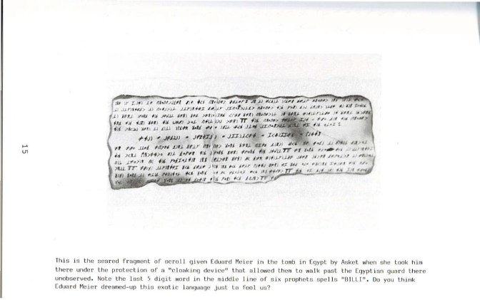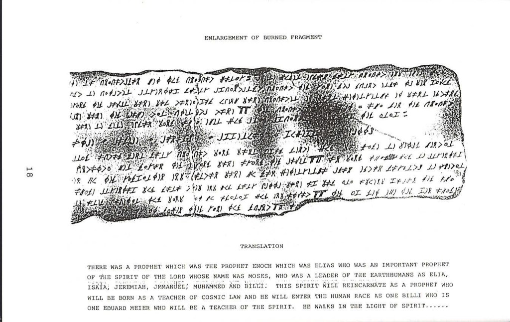 A Mr. Jim Crowley from England secretly photographed an ancient document (that is in possession) of a noble private collector, and he sent Billy photos and negatives and asked him, whether he, Billy, or the Pleiadeans/Plejarans could decipher the letters.