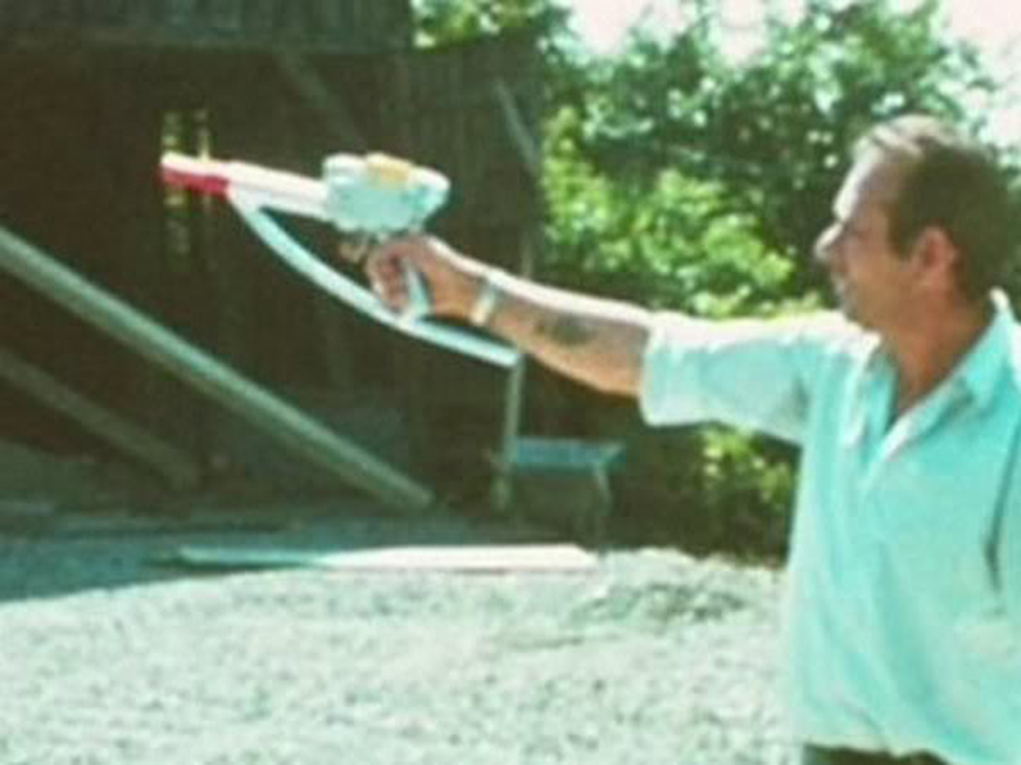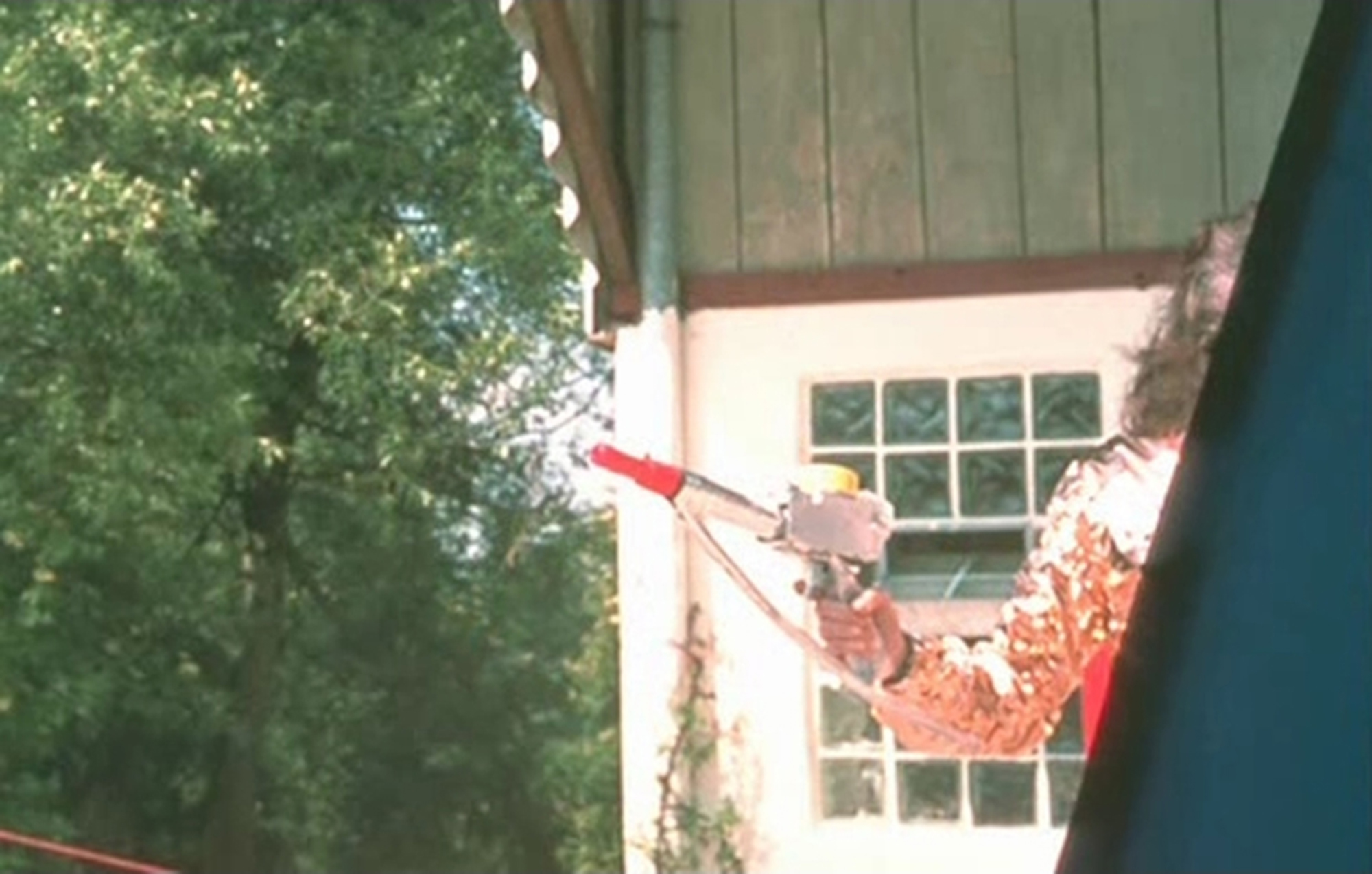 Billy在房屋前手持一把从Menara那里“借来”的致命镭射枪。