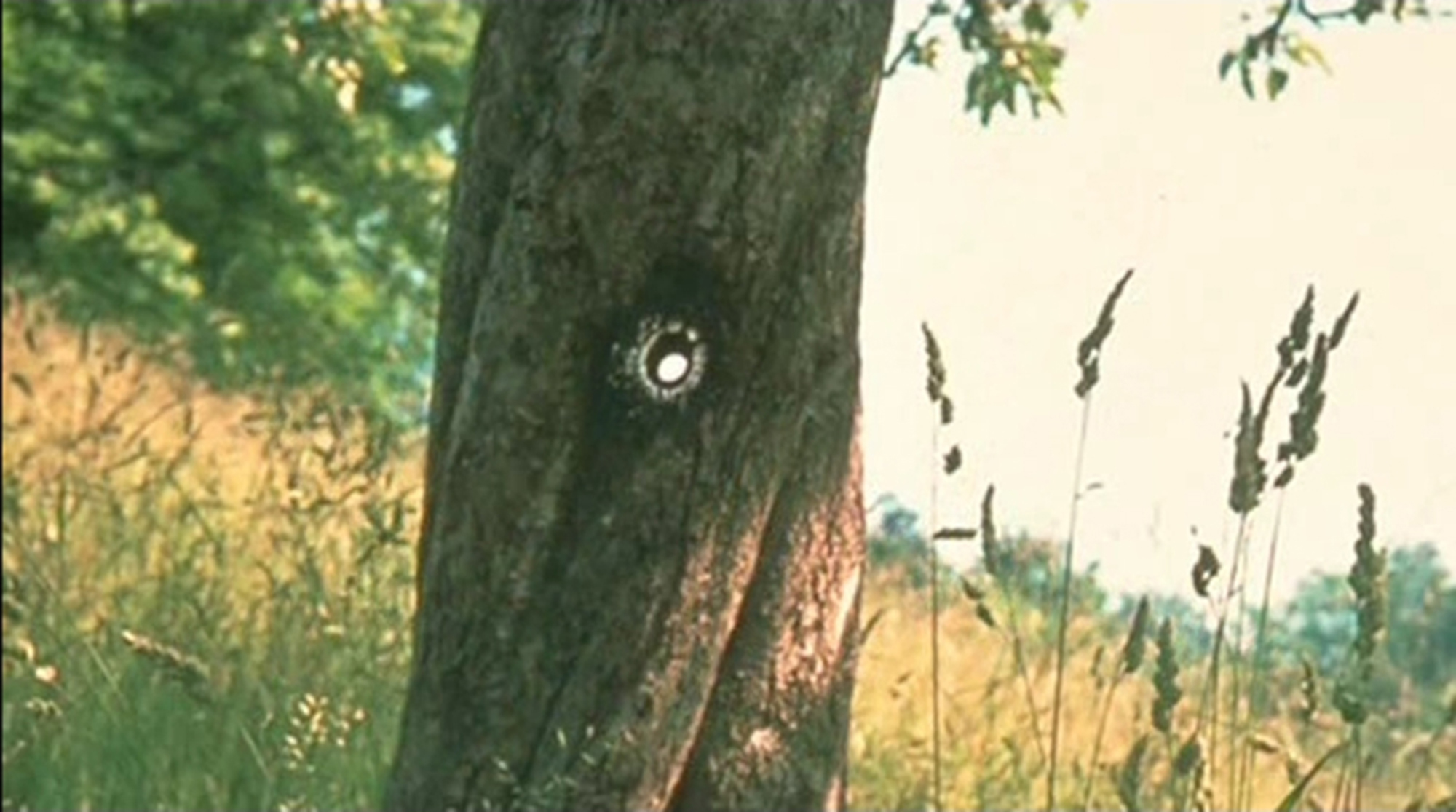 Billy使用(Manara的)镭射枪朝中心附近的一处树林发射了激光光束,这是在一棵树的树干上留下的灼穿孔(遗迹)。