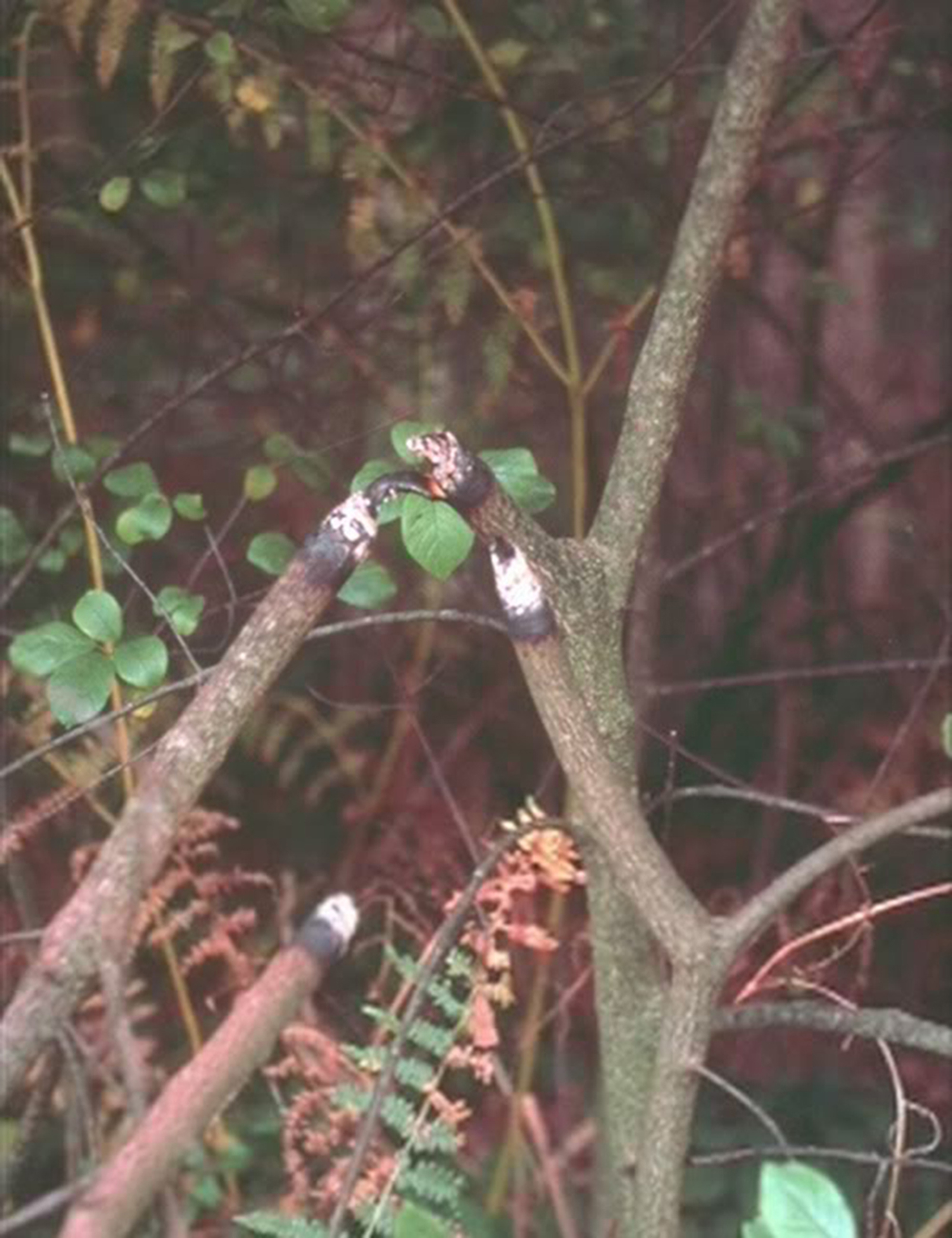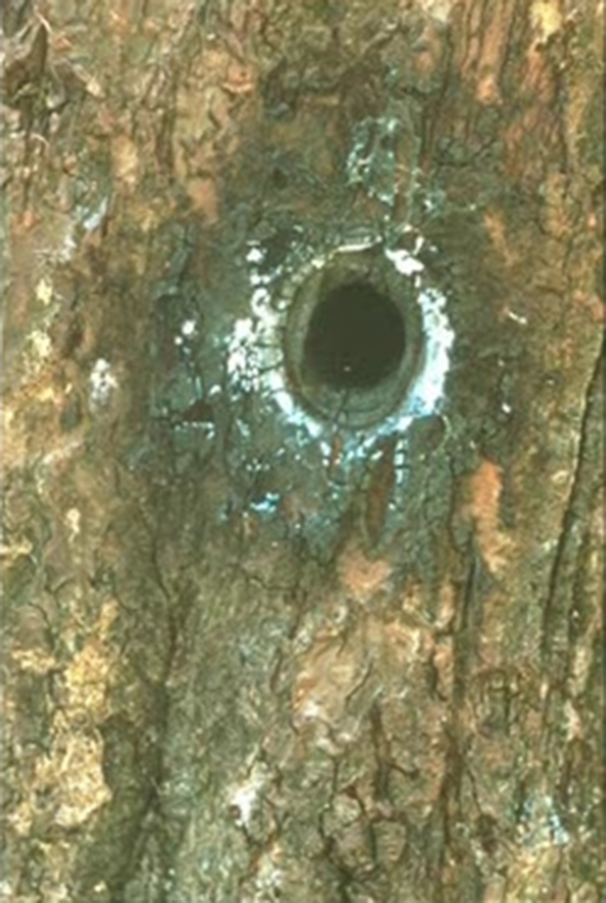 Billy使用(Manara的)镭射枪朝中心附近的一处树林发射了激光束,这是在一棵树的树干上留下的灼穿孔…局部放大版照片。