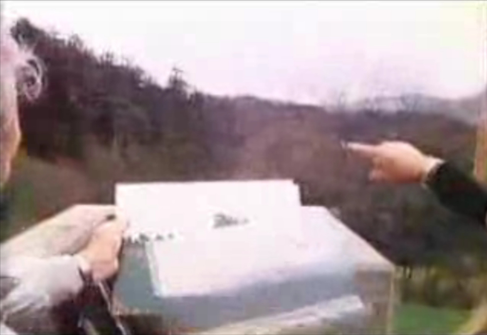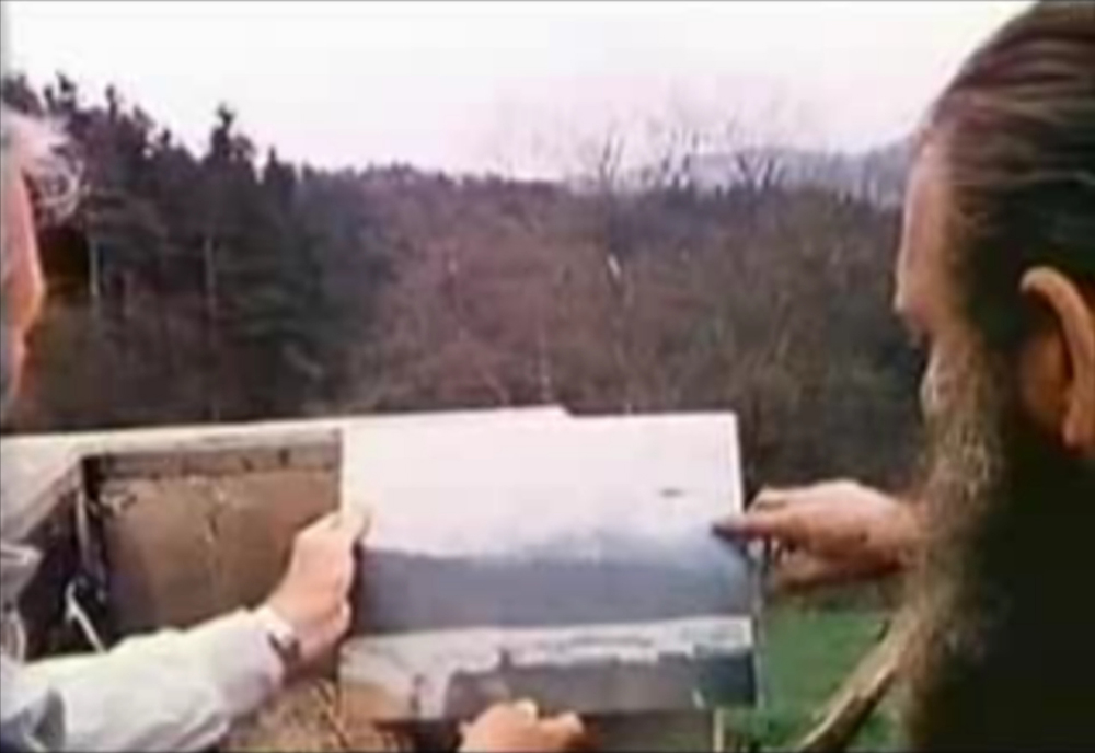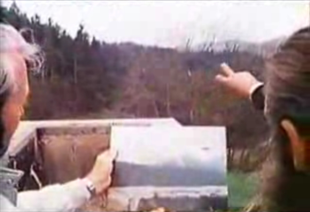 这些映像记录了 Billy(中)当时向调查领队Lt. Colonel Wendelle Stevens(左)和Lee Elders(右)解释…Semjases是如何操控光船在Ober-Sadelegg山谷上做展示性飞行,使他(Billy)可以很好地拍摄照片的…情景。
