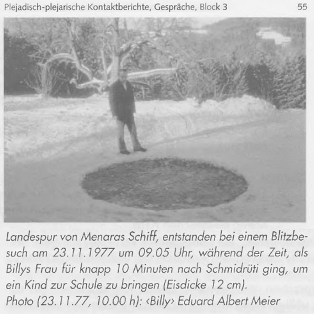 当时,Billy的妻子正送孩子去往附近的Schmidrüti(镇)上学,在大约十分钟的间隙里,Menara执行了一次快速访问,并留下了光船的着陆痕(当时的地表冰层厚达12厘米)。