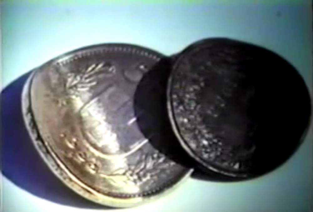 For the coin on the left, Billy wedged it in between two tables, and with a light touch with the back of his hand, he bent the coin using the power of his spirit.